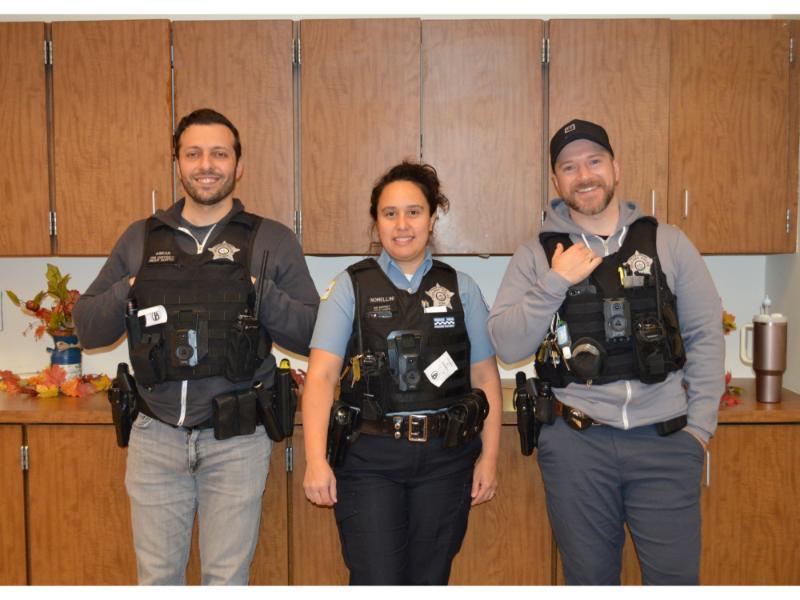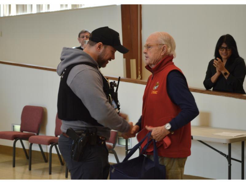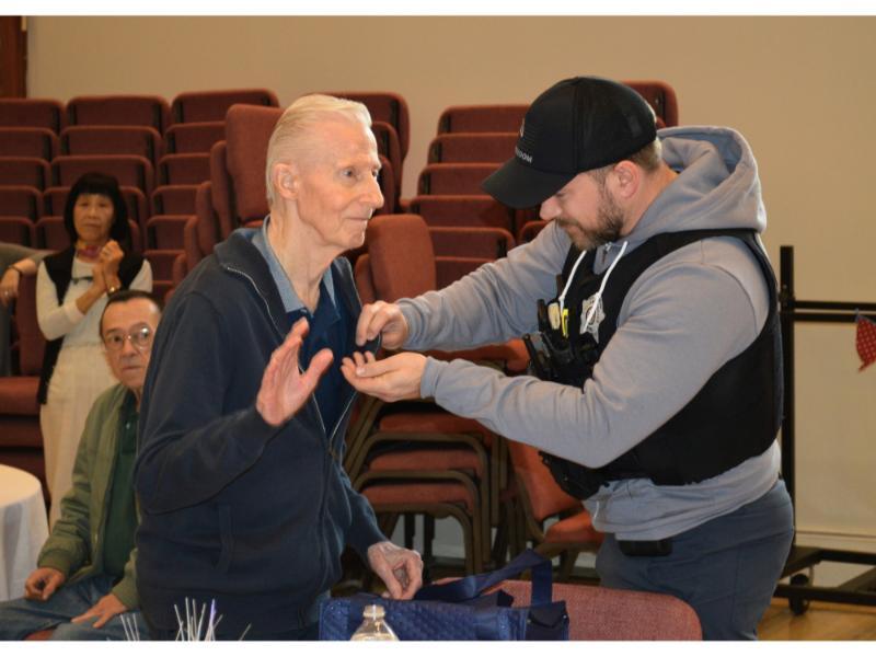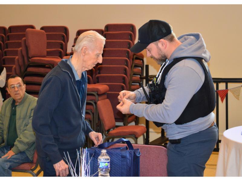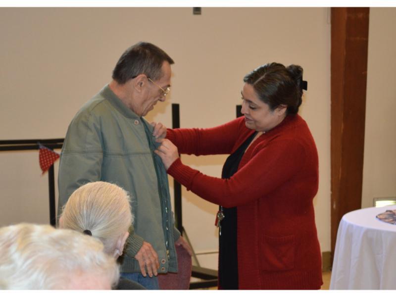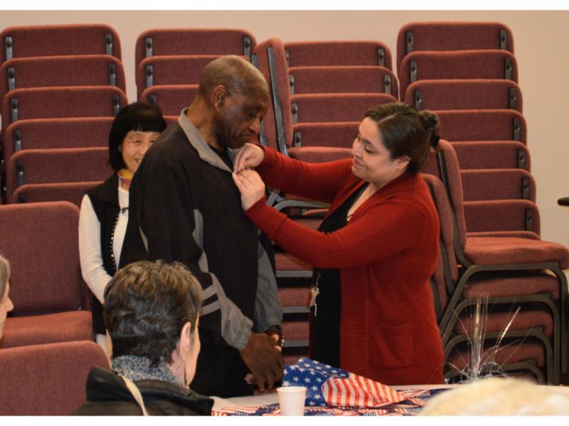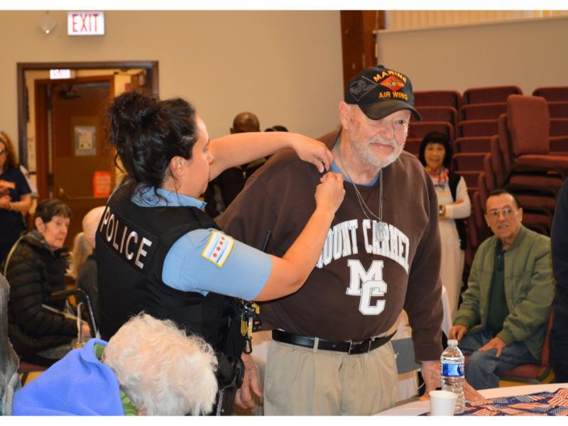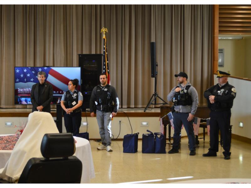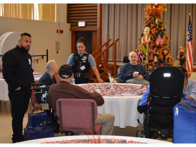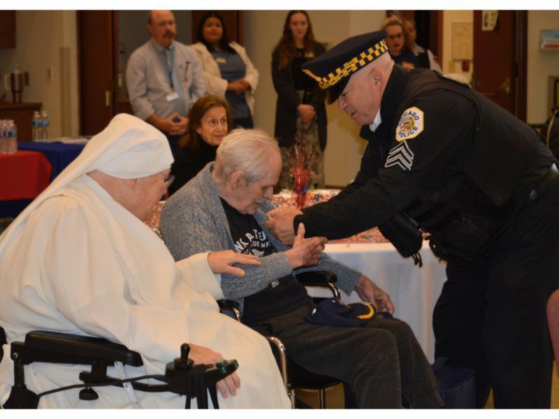 We began the morning, hand on heart, with the singing of the National Anthem. Aided by the Chicago Police Officers of the 18th District, Residents of St. Mary’s Home and Jugan Terrace who served in the arm forces were able to be recognized for the sacrifices they made for our country. Officers took turns shaking the hands of each veteran as they presented them with a gift bag and a commemorative pin. Our brave vets stood proudly as the pin was secured to their lapels while the rest of the room clapped and cheered in recognition. We were also able to recognize previous Residents who bravely served that have passed away. Though they are no longer with us, their service will not be forgotten.