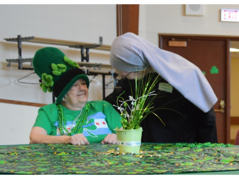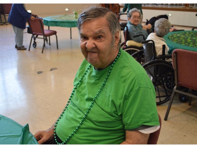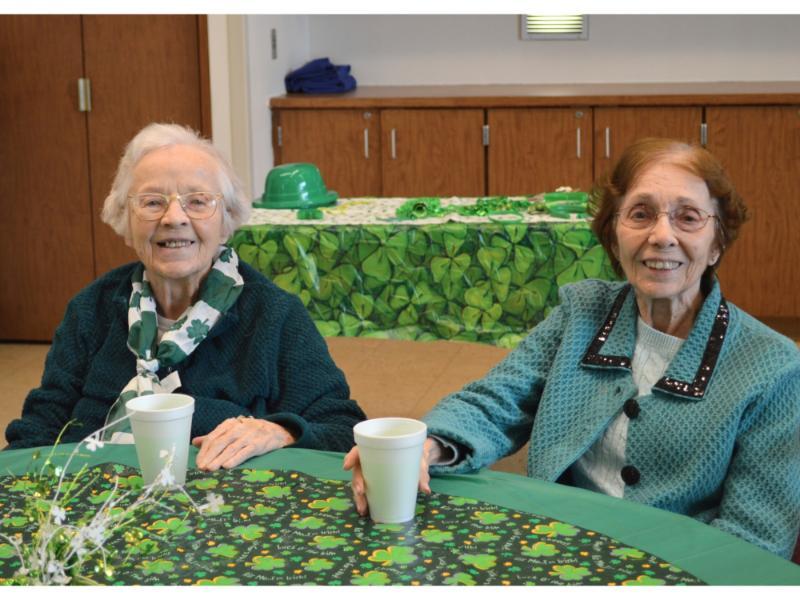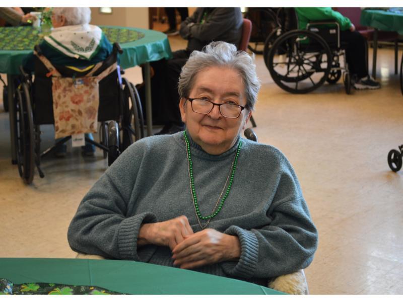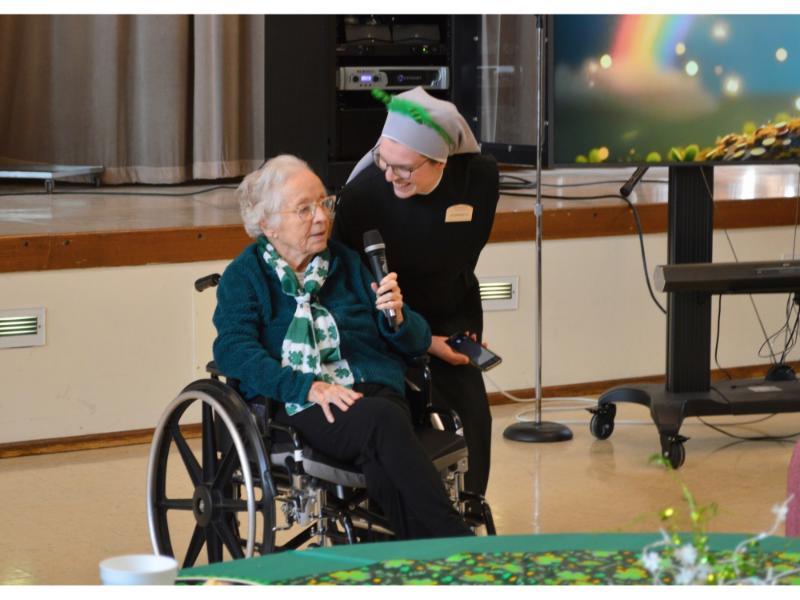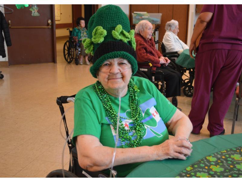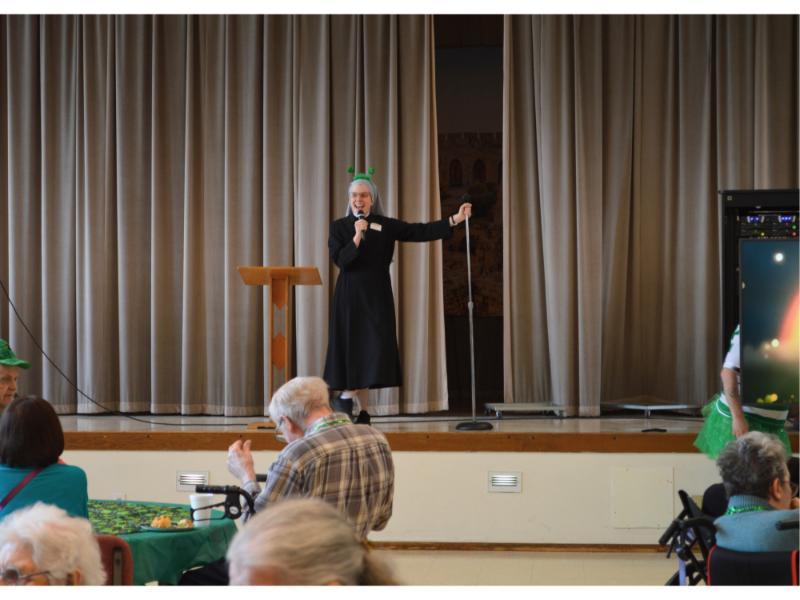 Resident Janette Satterlee looked especially fantastic wearing her homemade crochet leprechaun hat! To broaden the Residents’ smiles, Sister Bernadette took to the stage to invite staff members to do their best Irish jig. Laughter was heard from every corner of the room as Residents clapped and swayed along in their seats. Residents Peggy O’Leary and Frances Connelly, who each have Emerald Isle ancestry, came to the front to lead the room in a few traditional Irish tunes that livened everyone’s spirits.