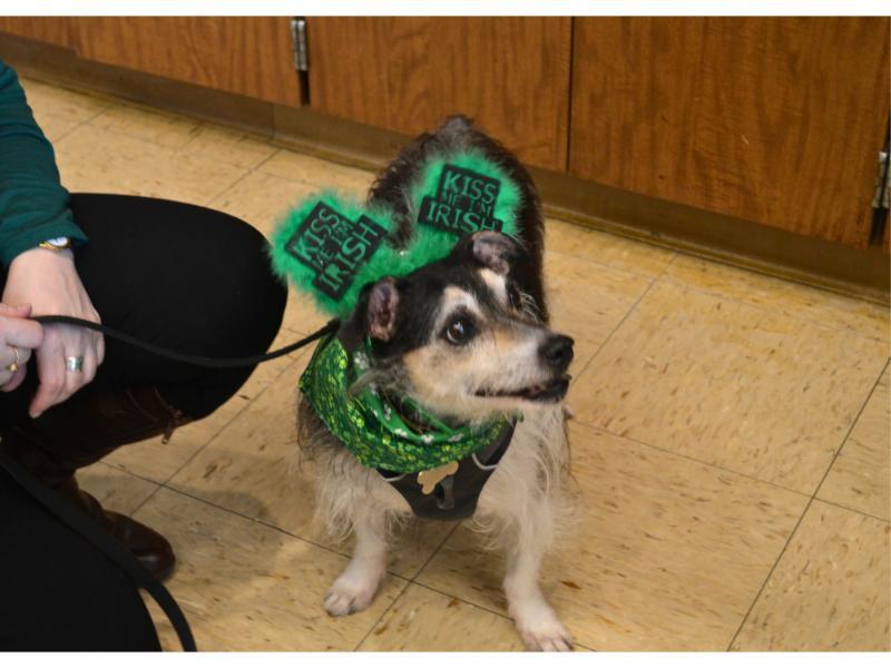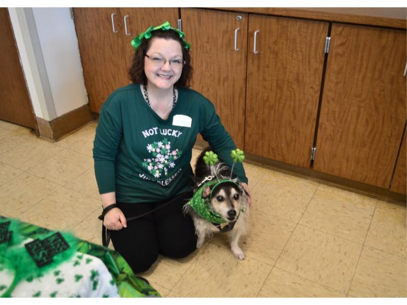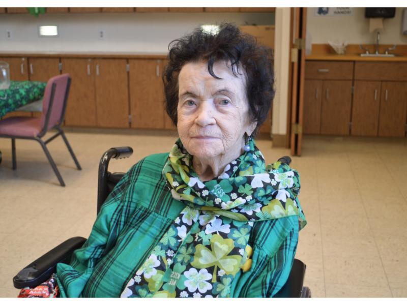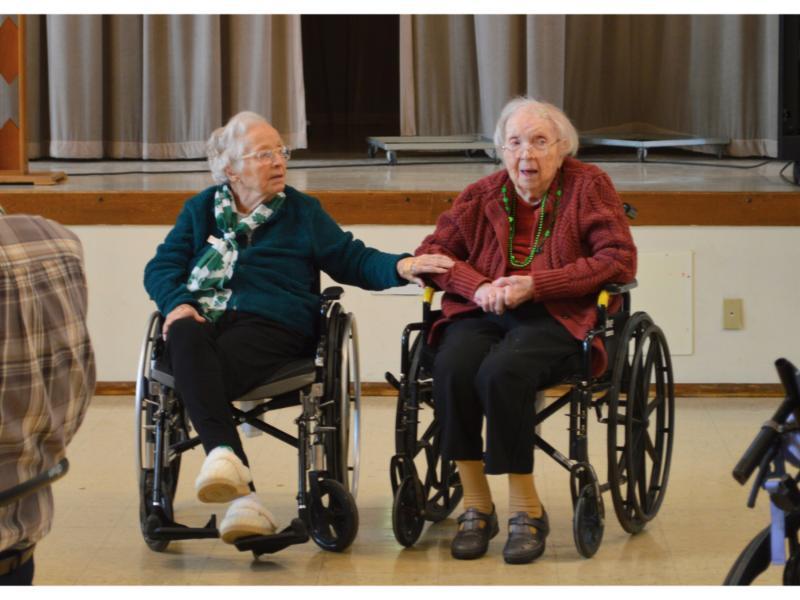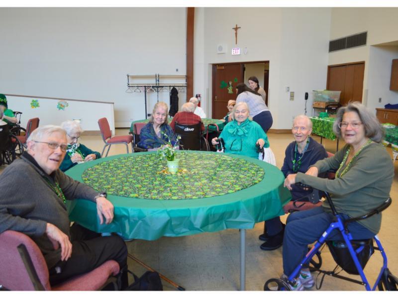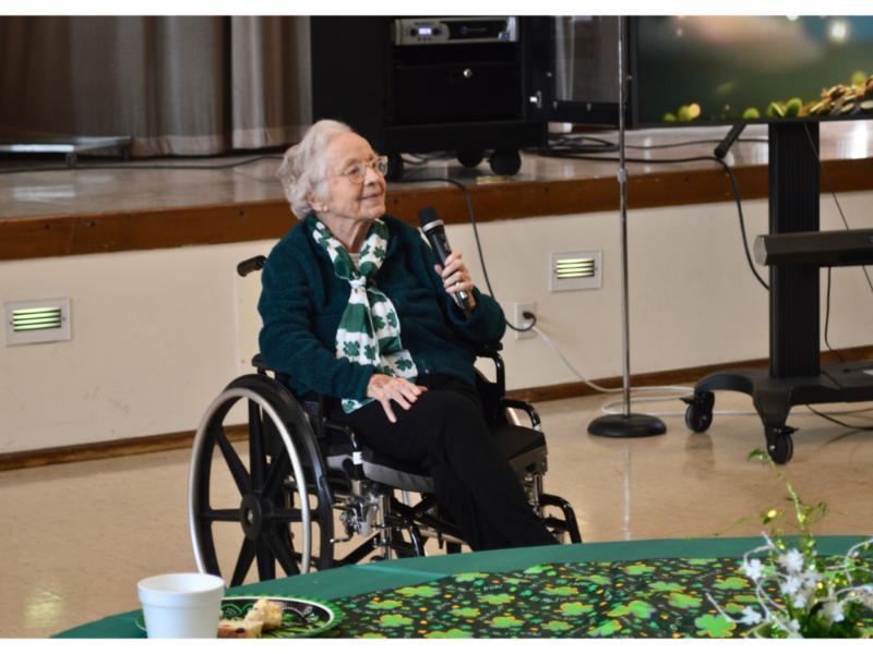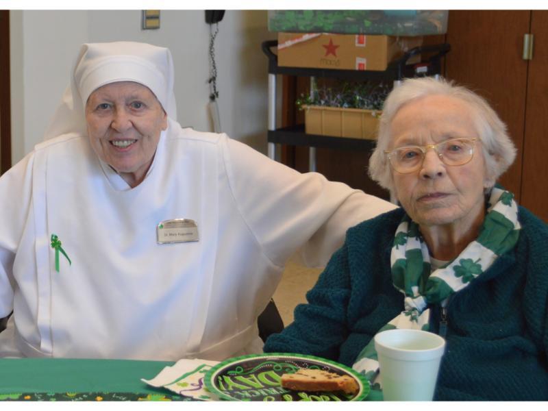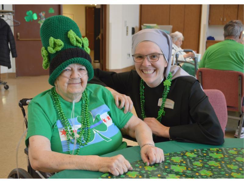 Resident Janette Satterlee looked especially fantastic wearing her homemade crochet leprechaun hat! To broaden the Residents’ smiles, Sister Bernadette took to the stage to invite staff members to do their best Irish jig. Laughter was heard from every corner of the room as Residents clapped and swayed along in their seats. Residents Peggy O’Leary and Frances Connelly, who each have Emerald Isle ancestry, came to the front to lead the room in a few traditional Irish tunes that livened everyone’s spirits.