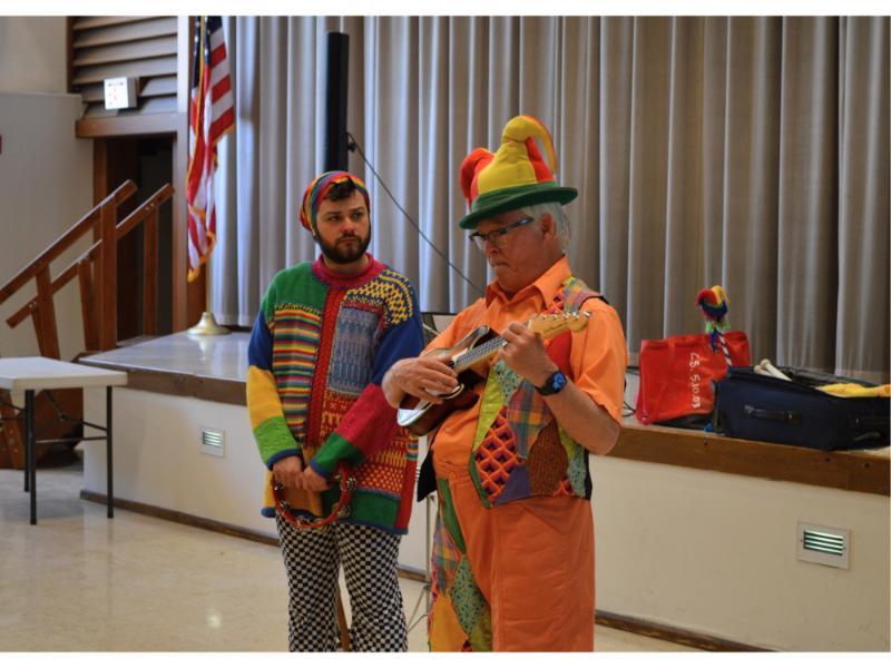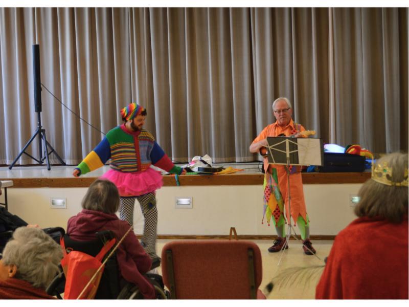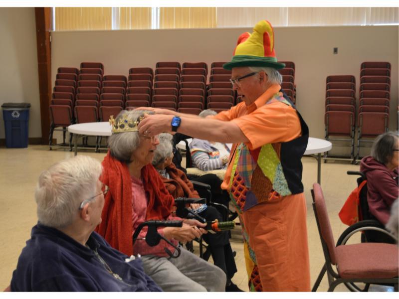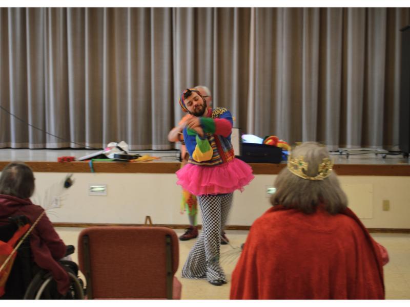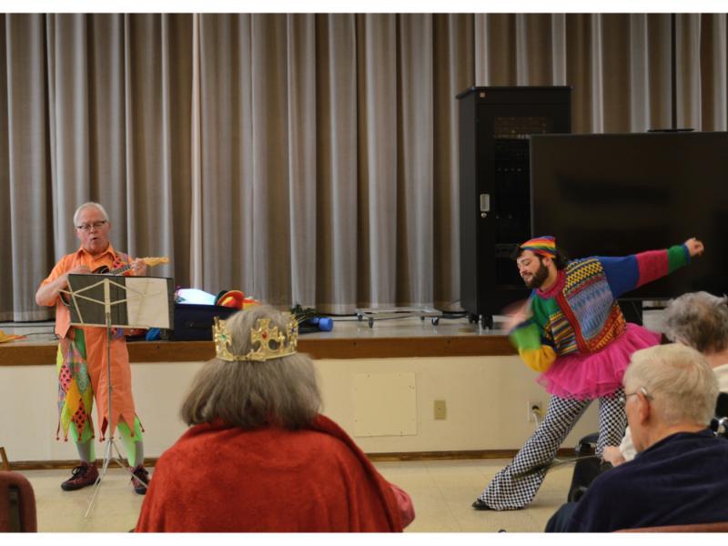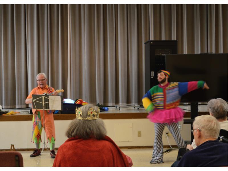 Two Vaudeville Chicago performers, dressed as court jesters, came prepared to give our Residents a barrel of laughs with well-timed slapstick gags while singing familiar tunes. Strumming ukuleles and something called a fish-tambourine—or “fish-borine” for short—these whimsical jesters brought with them shakers, clackers, and all sorts of goofy noisemakers for Residents to play and to get in on the act. Whether it was waving oversized peacock feathers, busting out their best dance moves, and even crowning one Resident the queen of the performance, Residents loved getting involved in the hijinks these goofballs created.