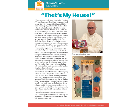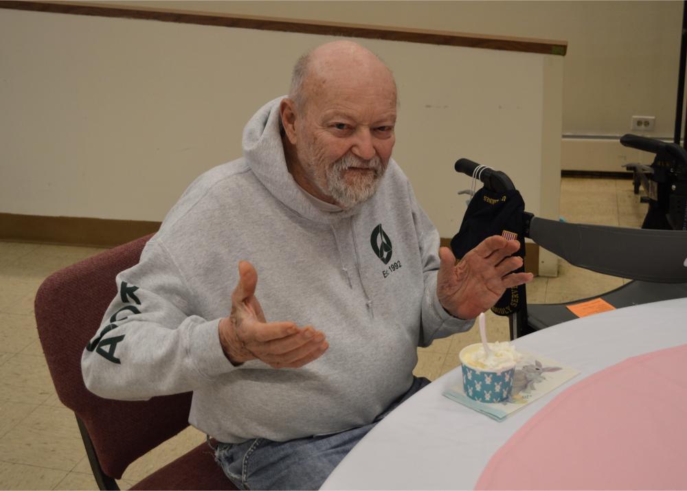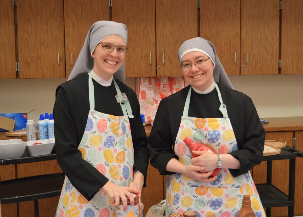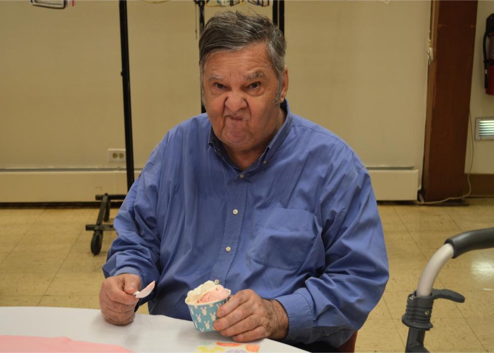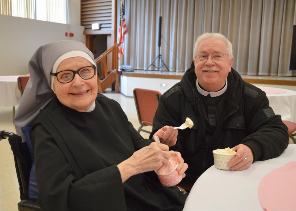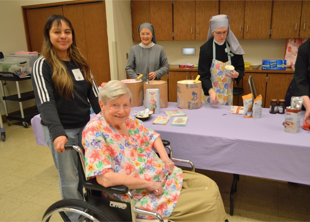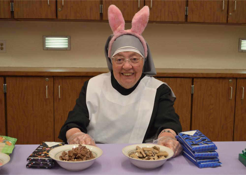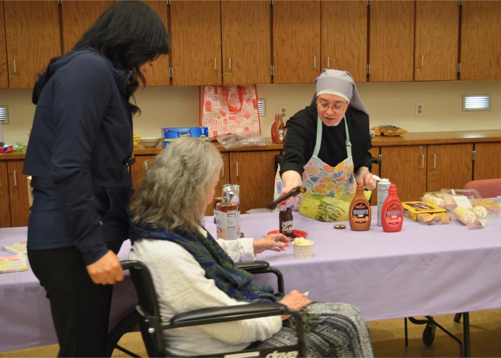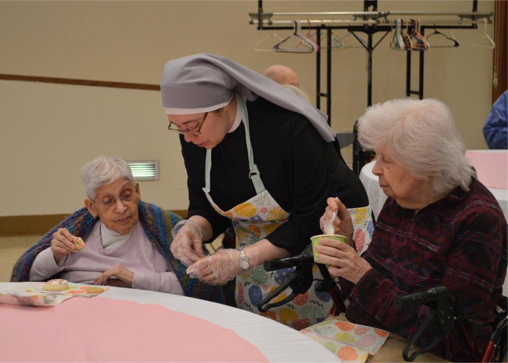 There are few things sweeter in our Home than an ice cream social and quality time with one another. Easter Monday at St. Mary’s Home gave our Residents just that! Our Sisters invited everyone—Residents, volunteers, and staff—to come celebrate the holiday with them with an ice cream social! Wearing their new Easter Egg themed serving aprons, Sisters enthusiastically served up chocolate, vanilla, and strawberry ice cream with all the extras to a line of excited guests. Our new Sister, Sister Rose Marie, acted as the impromptu Easter Bunny, serving up whipped cream and delicious toppings to finish off everyone’s sweet treats. Listening to the hits of yesteryear, and with the company of their friends and neighbors here and St. Mary’s, Residents couldn’t help but have smiles on their faces.