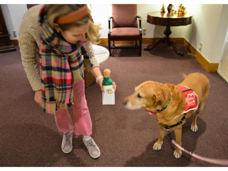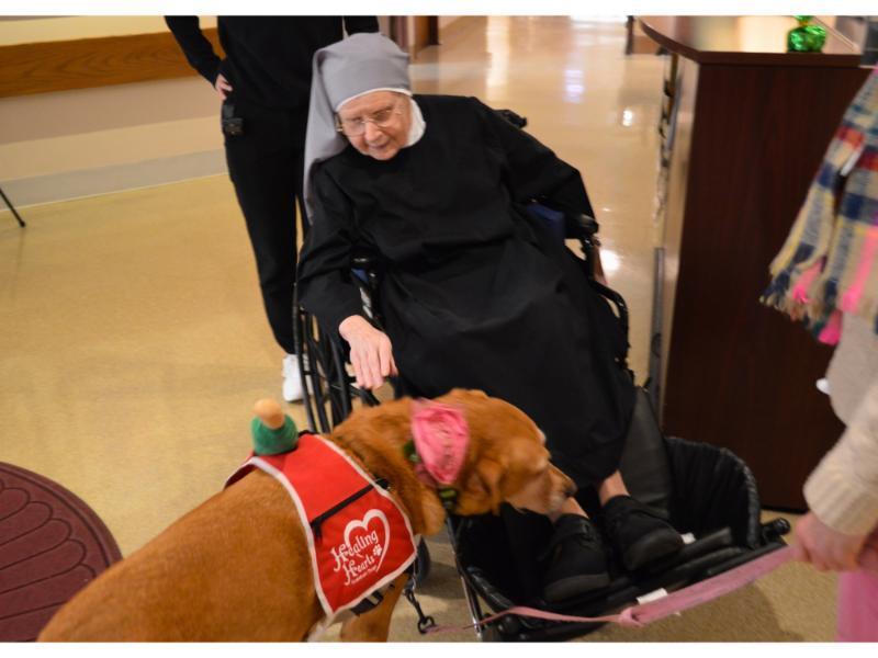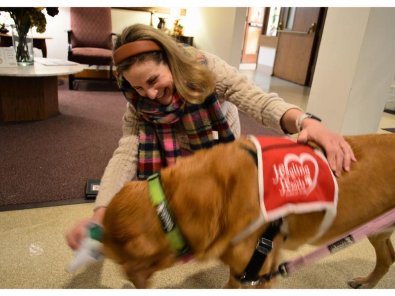 We are so lucky at St. Mary’s to have volunteers from all walks of life. And sometimes those volunteers come on four legs! Meet Gracie: a therapy dog with Healing Hearts. Healing Hearts raises and trains facility dogs and comfort dogs to interact with individuals who are experiencing trauma, stress, and physical and emotional uncertainty in their lives. This organization’s mission is to “enrich the lives of others by providing hope and healing through the compassion of canine companions.”