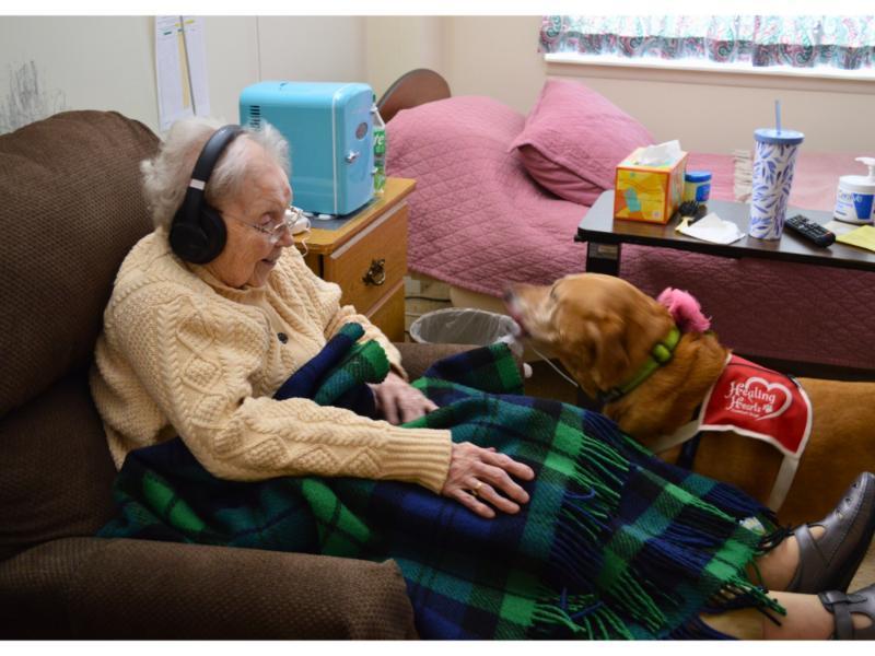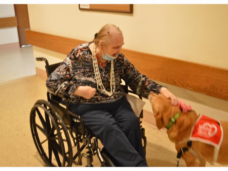 Accompanied by her mom and handler, Heather, Gracie blesses our Home by livening the spirits of our Residents, and is always a welcome sight when someone is having a “ruff” day. Gracie is celebrating her 9th birthday, and, as a thank you for all she has done for us, she was given a celebratory “champagne bottle” squeaky toy, plenty of treats, and lots of love.